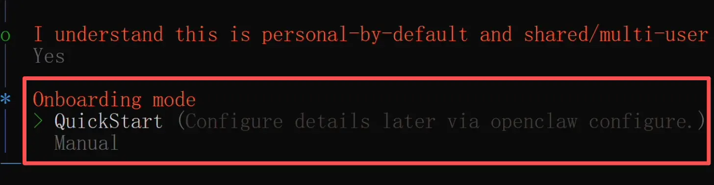 建议新手直接选 Quickstart,它会帮你用默认配置快速搞定,人工模式适合有一定养虾经验的同学。