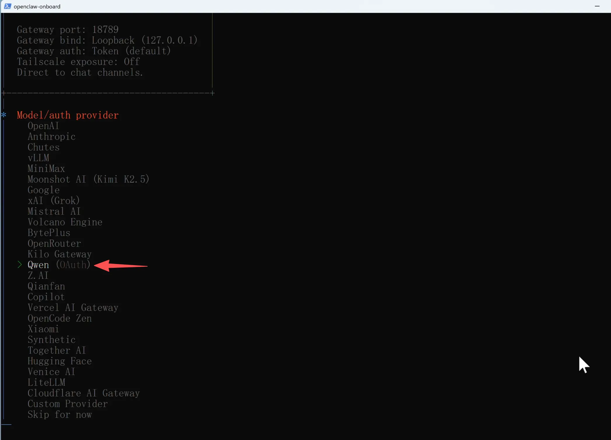 引导程序会列出一些 AI 平台供你选择,比如 Anthropic(Claude)、OpenAI(GPT)、Qwen(通义千问)等。