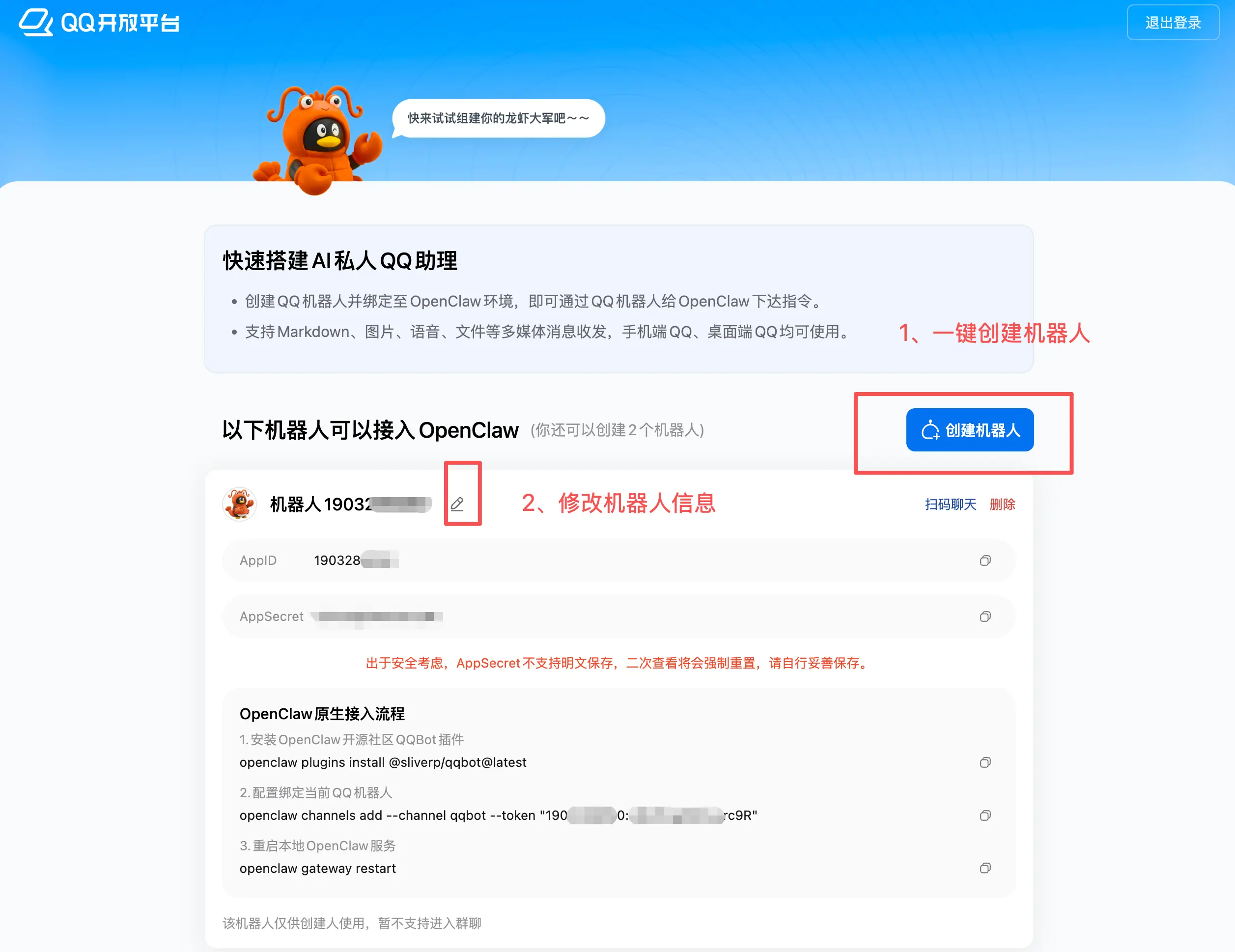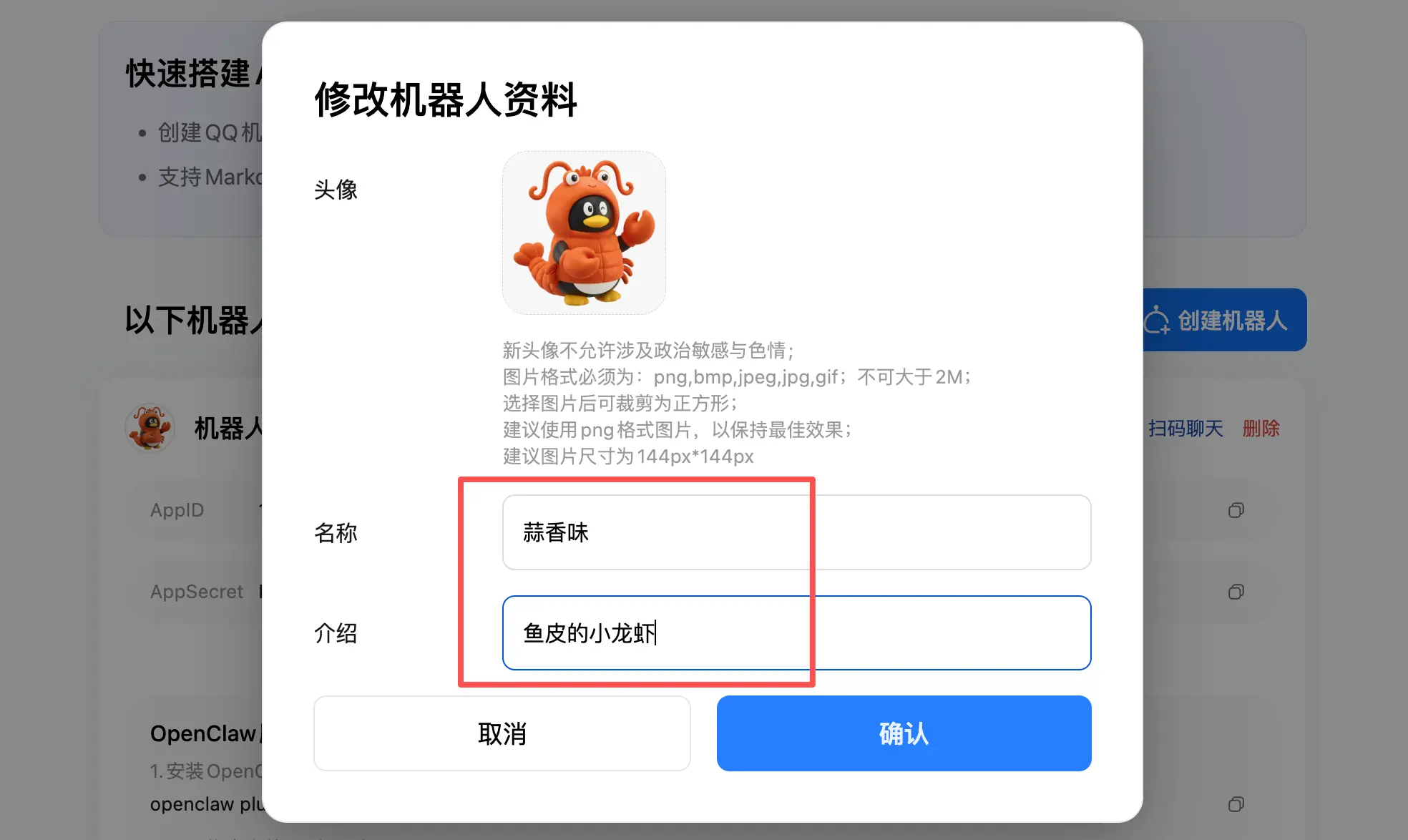 然后可以修改机器人的头像、昵称等信息,给你的龙虾起个好听的名字吧~