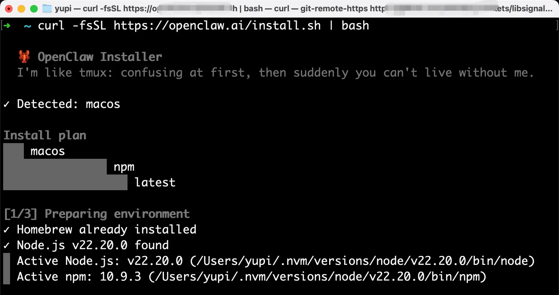 这行命令会自动帮你安装所有依赖和 OpenClaw 本体,一步到位,装完就可以直接跳到 第二步 - 安装配置 OpenClaw。