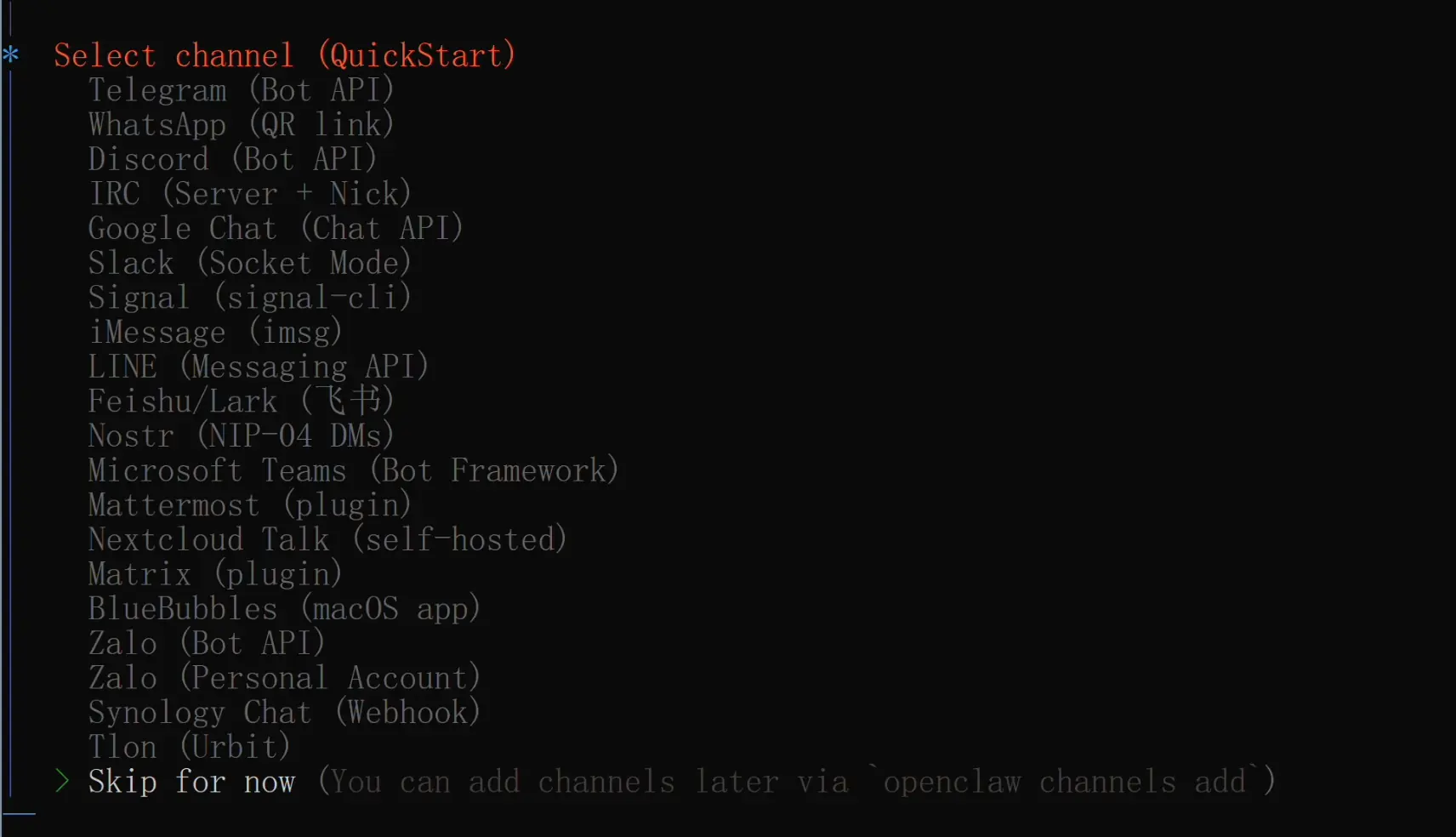 引导程序会问你要不要连接 Telegram、WhatsApp、Discord、飞书等聊天平台,更方便地跟龙虾对话。