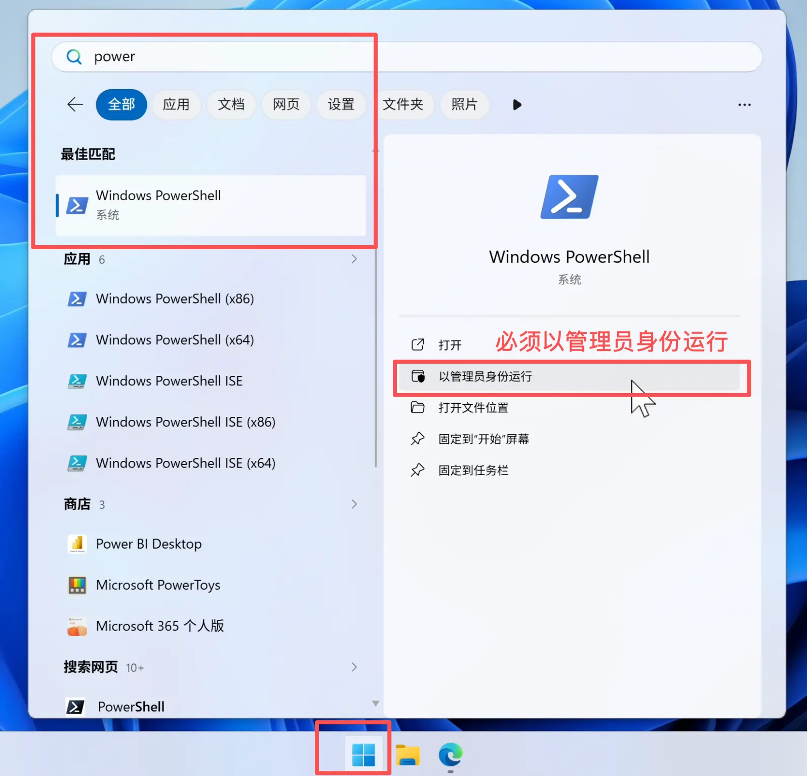 在电脑的搜索栏中输入 "PowerShell",右键选择 以管理员身份运行: