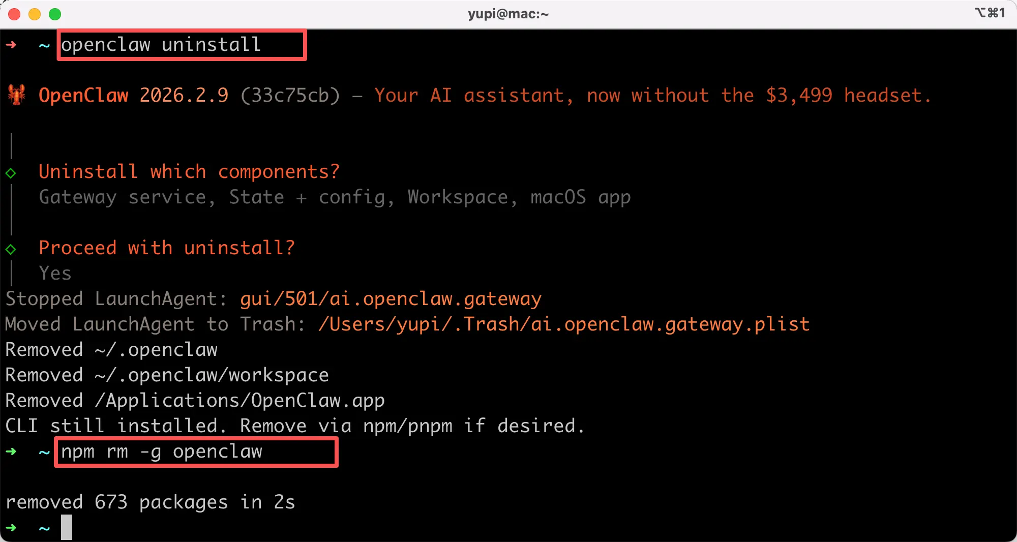 其实只需要执行一行命令,就能卸载 OpenClaw 了: