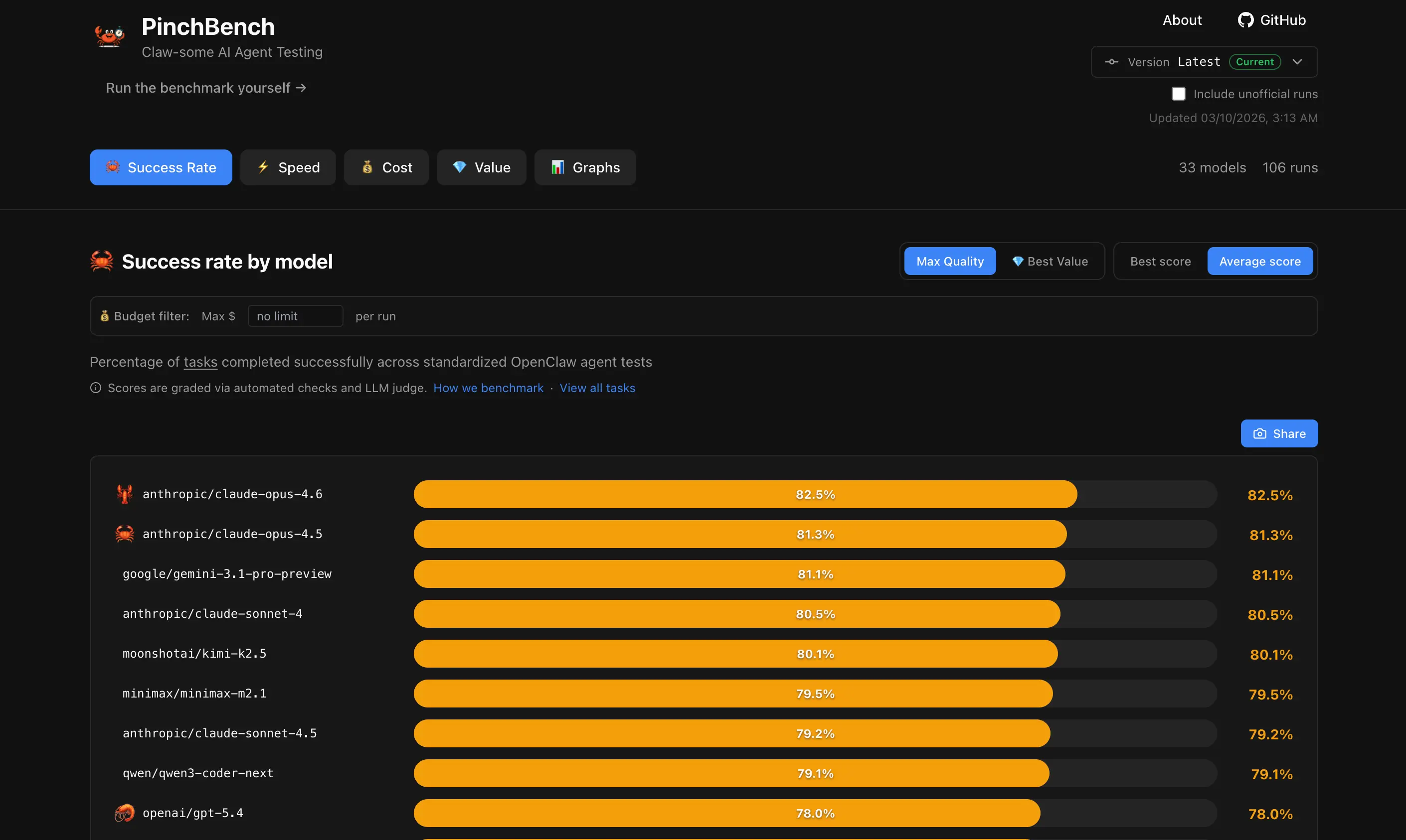 当然,你也可以选择其他大模型平台。如果你想了解各模型在 OpenClaw 场景下的实际表现,可以参考 PinchBench 排行榜,这是一个专门测试大模型做 OpenClaw 任务的评测网站。目前成功率最高的是 Claude Opus 4.6(成功率 82.5%),最便宜的是 Google 的 gemini-2.5-flash-lite(每次任务只要 1 毛钱)。