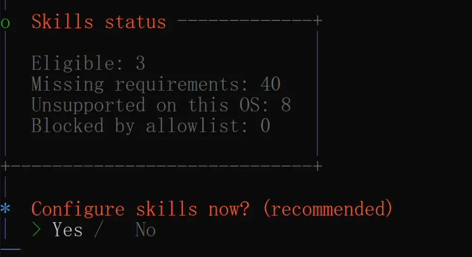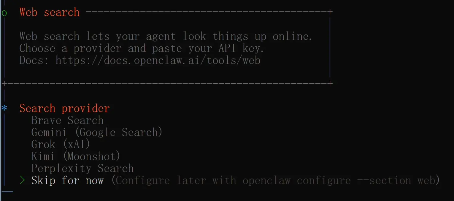 接下来还会问你要不要配置搜索服务提供者(比如 Brave Search),也建议先跳过,这些都需要额外申请 API Key,后面有需要再配: