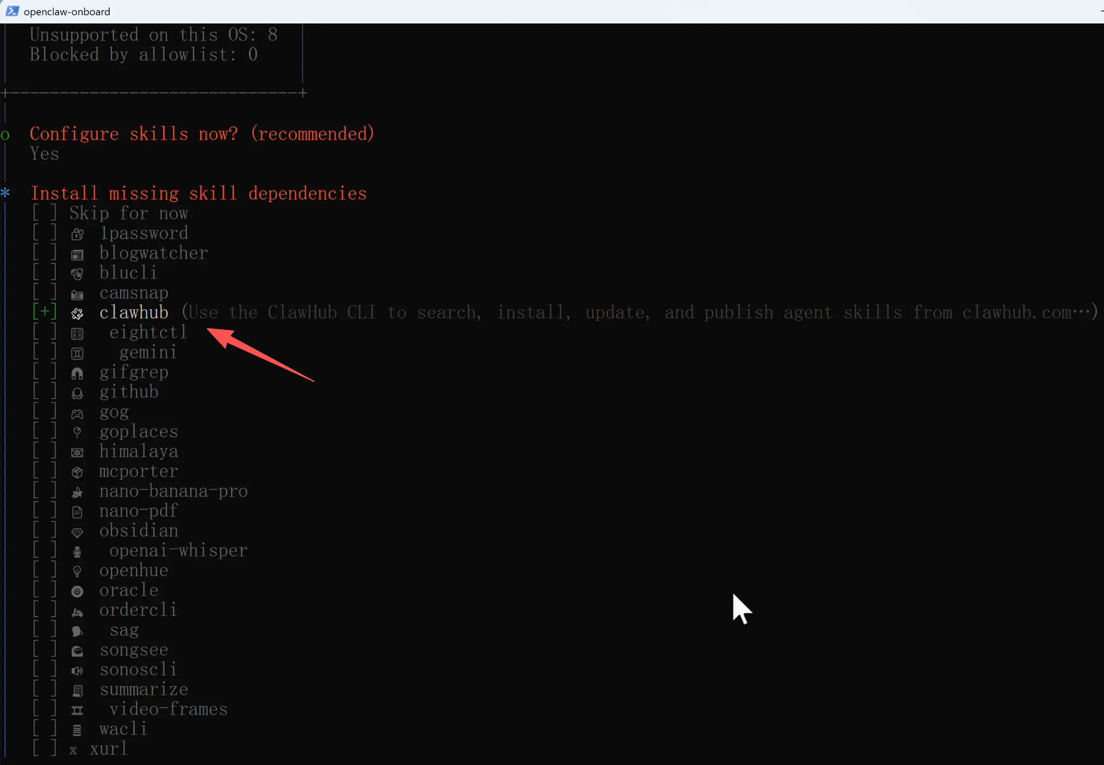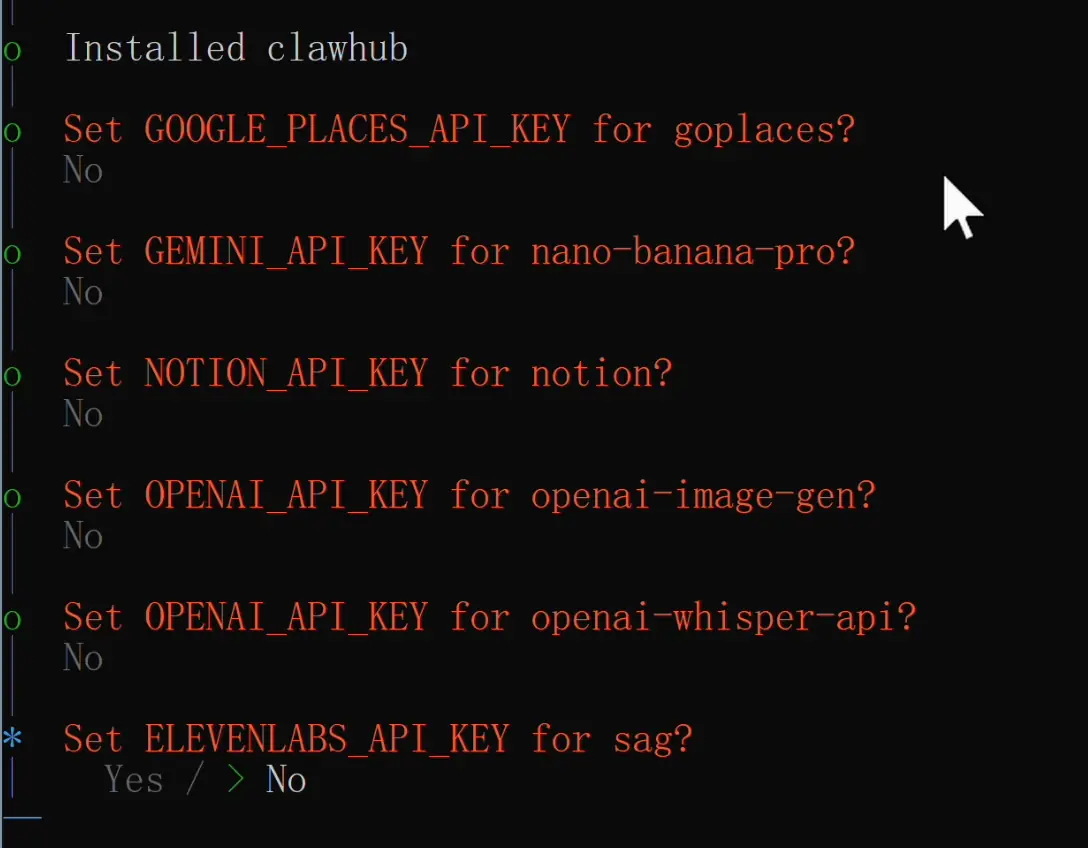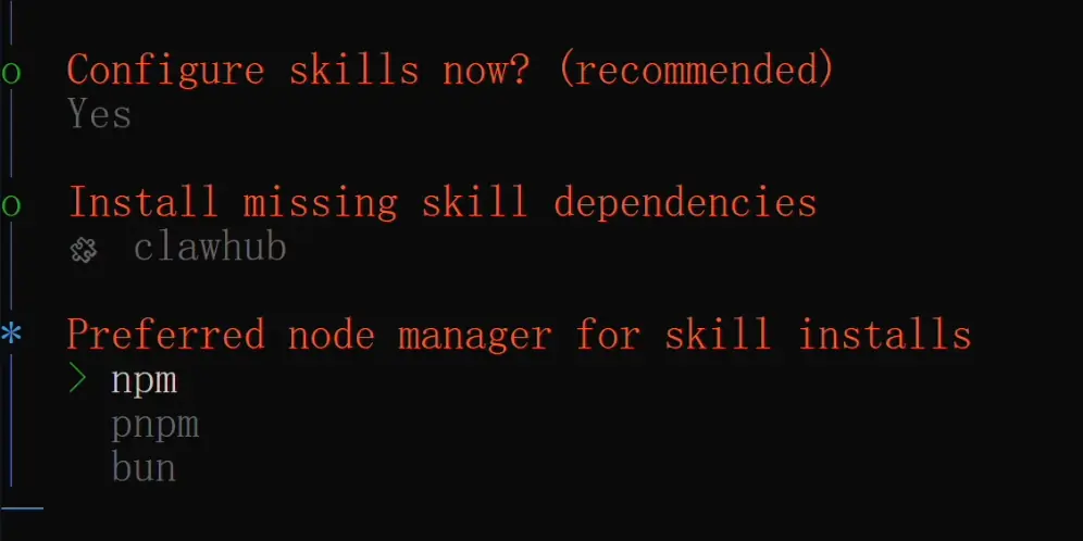 然后引导程序会列出一些推荐的技能包,这里建议至少添加 ClawHub 这一个。ClawHub 是 OpenClaw 的官方技能市场,装了它之后,你的小龙虾就可以随时搜索和安装社区里上千个技能包,快速扩展自己的能力,非常方便。其他的技能按需选择即可。