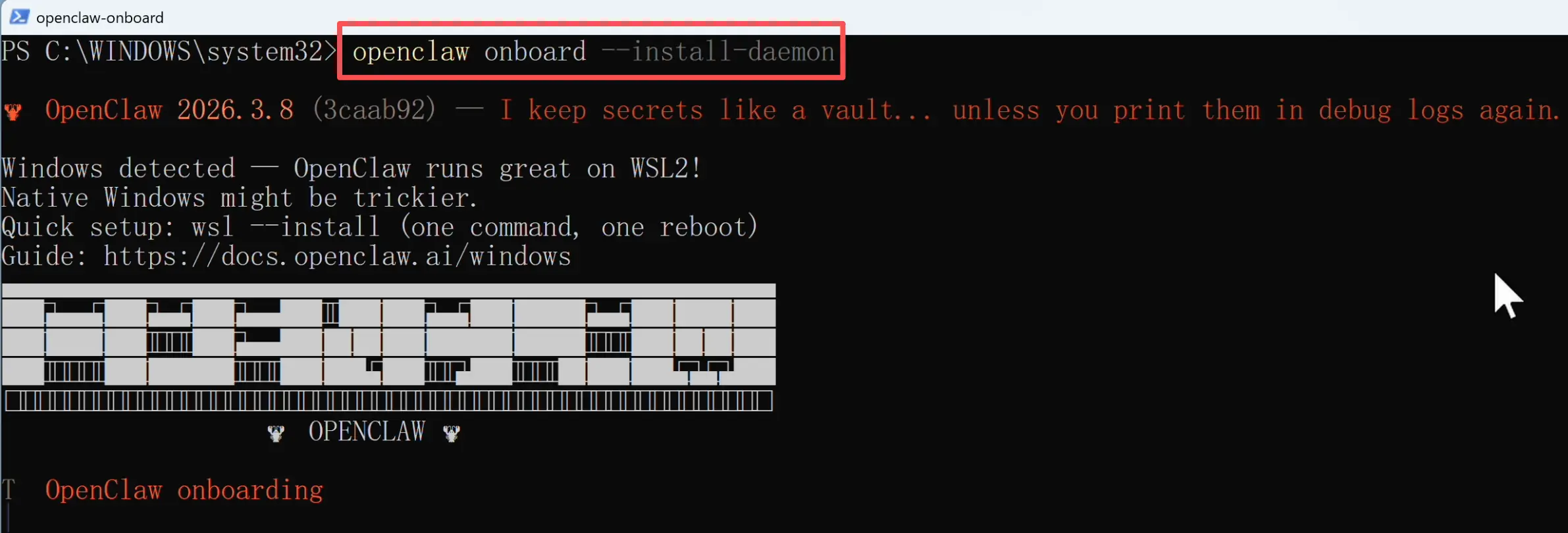 onboard 就是新手引导的意思,--install-daemon 是指 "顺便把后台服务也装上",让 OpenClaw 在后台持续运行,关掉终端也不会停。