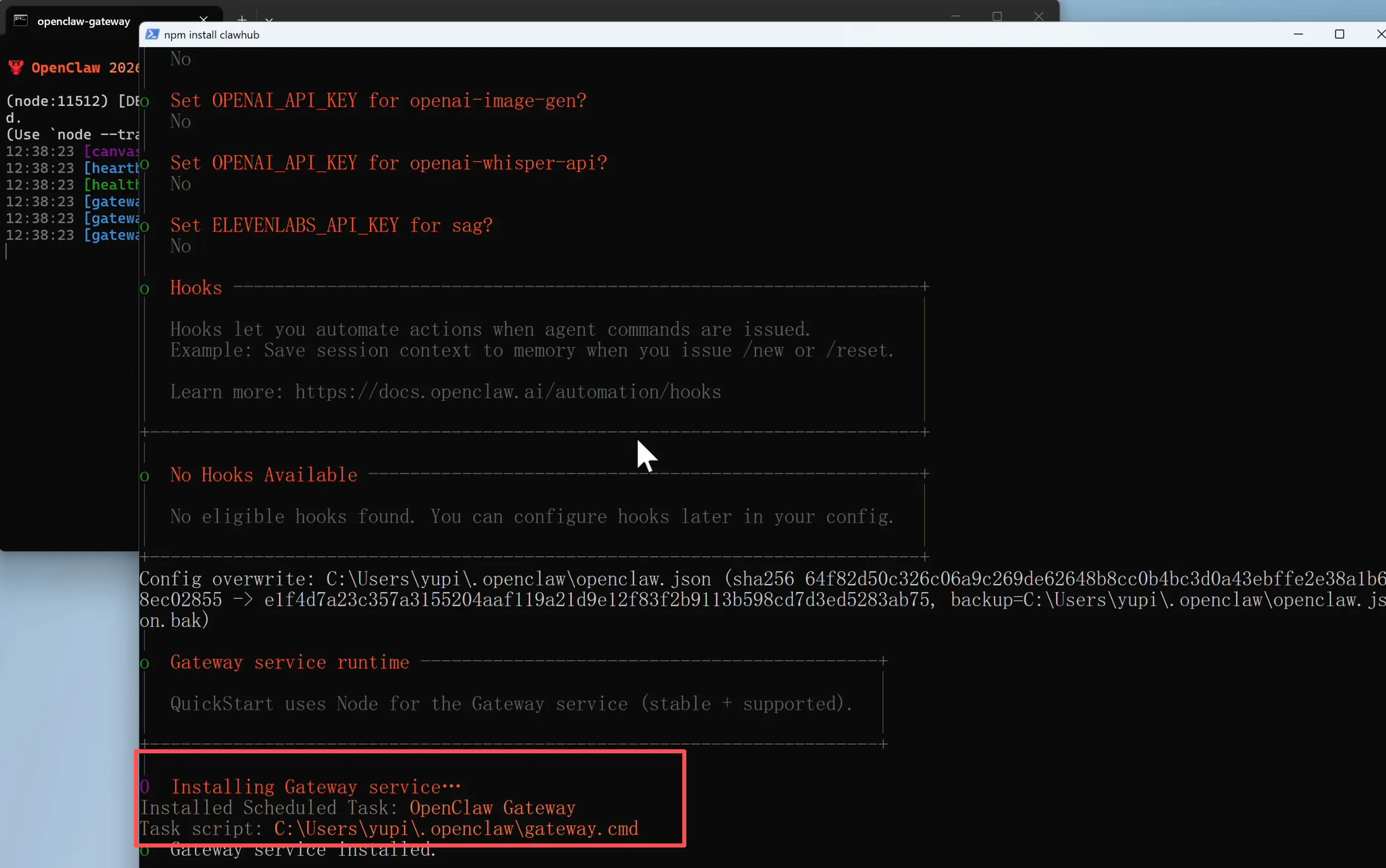 接下来会自动安装并启动 OpenClaw 的 Gateway 网关服务。你可以把网关理解成 OpenClaw 的总调度中心,它负责接收你从各个渠道(网页、QQ、飞书等)发来的消息,分配给 AI 处理,再把结果返回给你。