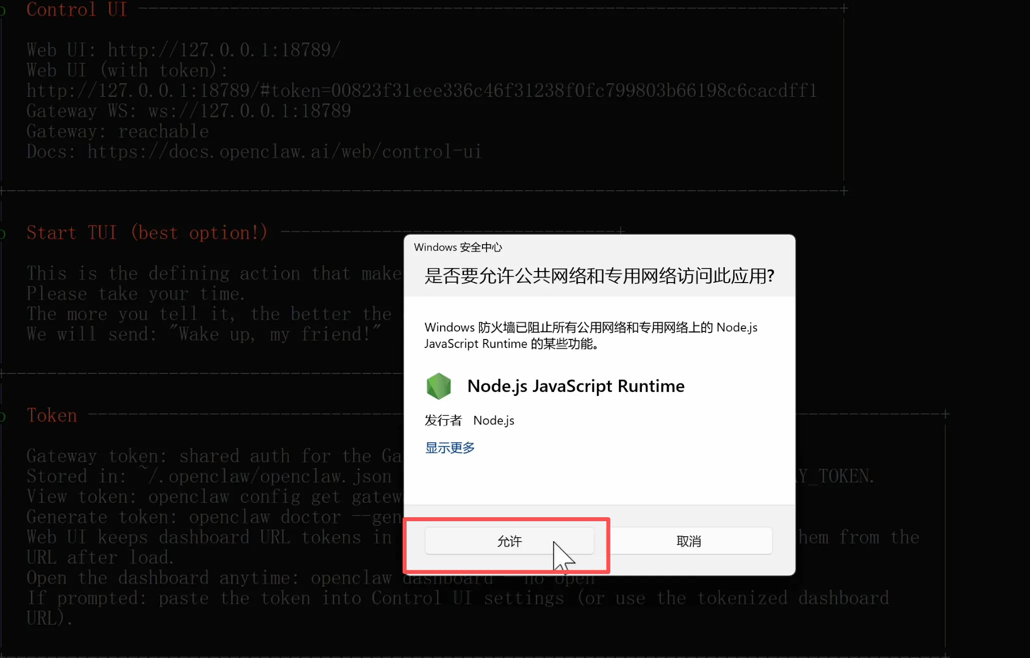 这时候 Windows 可能会弹出防火墙提示,问你是否允许公共网络和专用网络访问,一定要点允许! 否则网关服务无法正常工作。