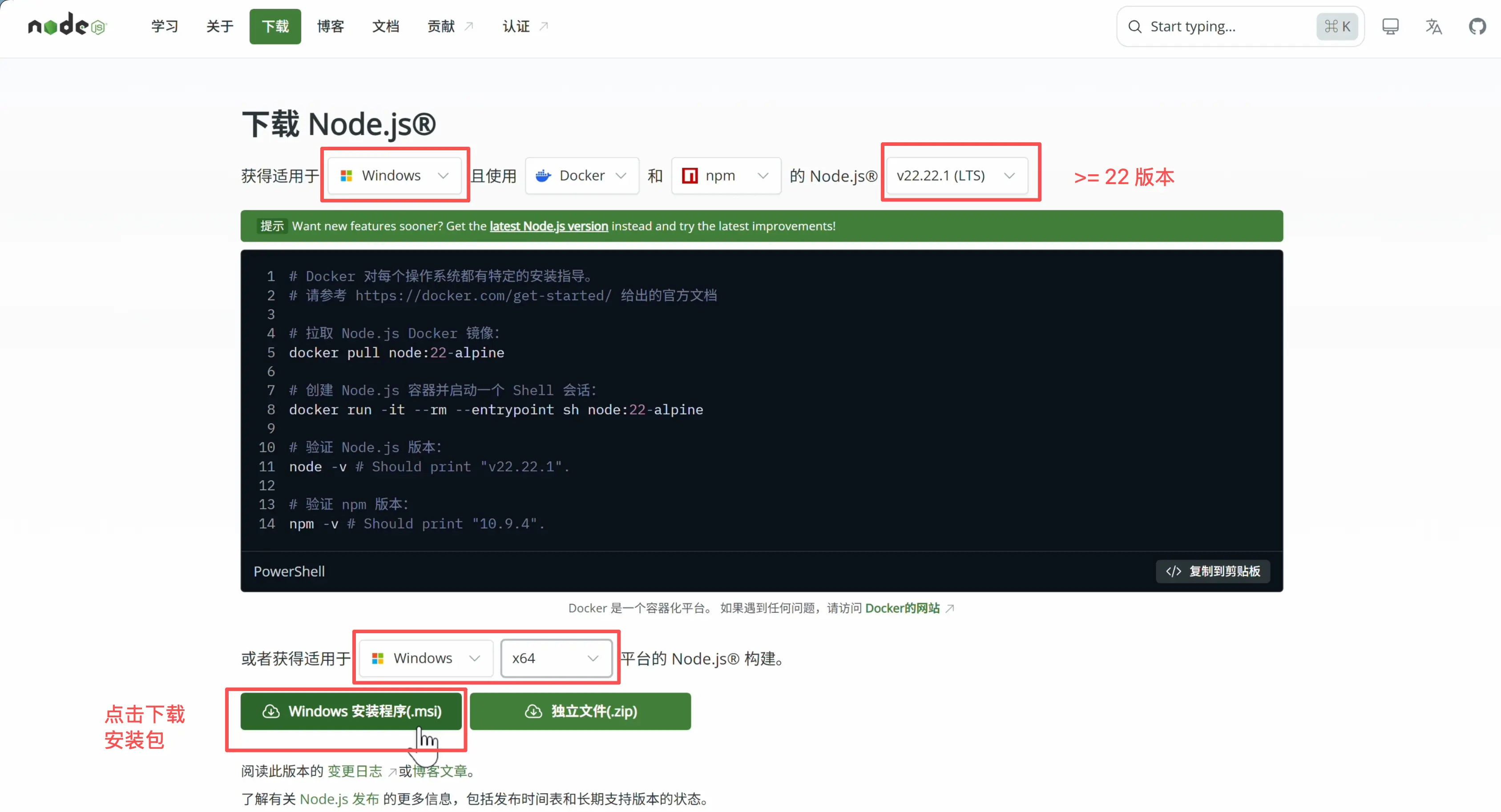 打开 Node.js 官网,选择对应你操作系统的安装包,并执行下载。注意版本号 至少选 22 以上,低于这个版本就会逮虾失败。