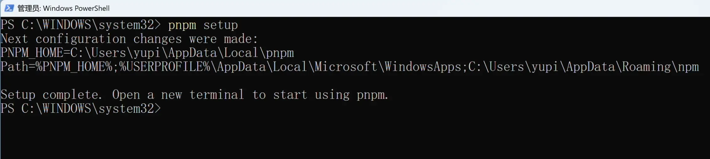 注意!执行完 pnpm setup 后,一定要关闭当前 PowerShell 窗口,重新以管理员身份打开一个新的。 这是为了让刚才配置的环境变量生效。