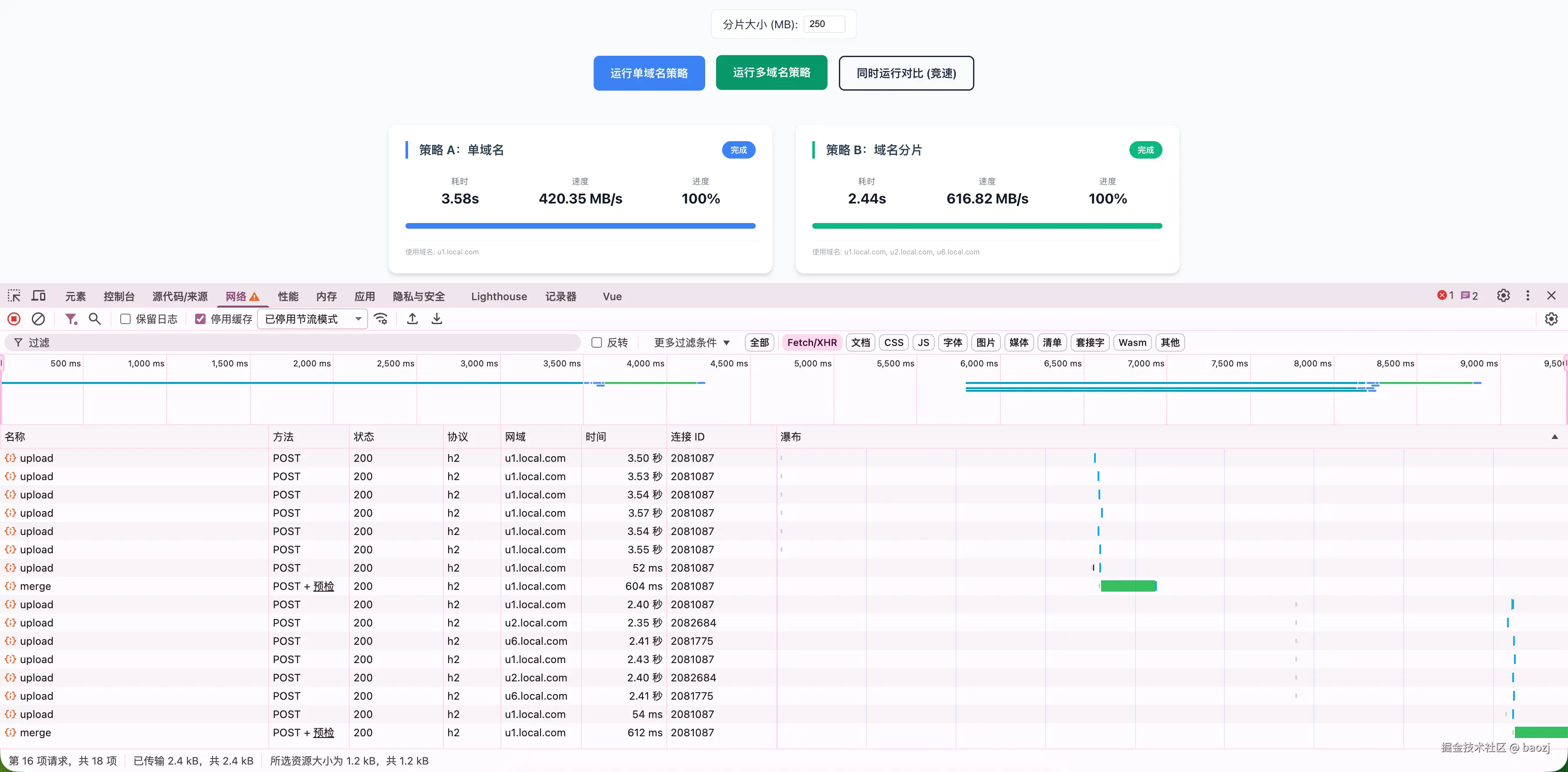 实验准备就绪。我用一个约 1.5G 的测试文件,在同样的本地网络环境下,分别跑了"单域名常规上传"和"多域名分片上传"。