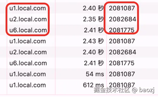 再看底下的请求列表,发往 u1.local.com、u2.local.com 和 u6.local.com 的请求,分别拿到了 三个独立的 TCP 连接 ID(2081087、2082684、2081775)。