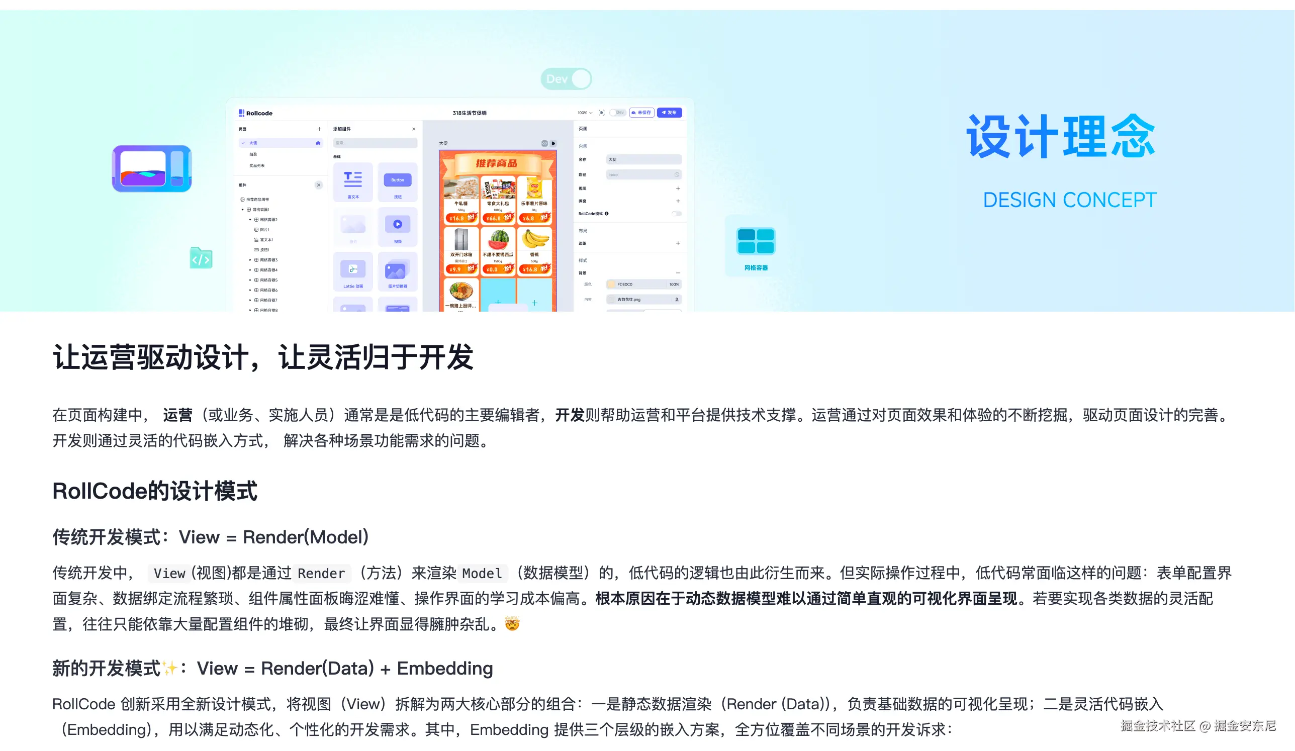 而在 RollCode 的设计里:页面既可以通过可视化搭建,也可以通过代码扩展。