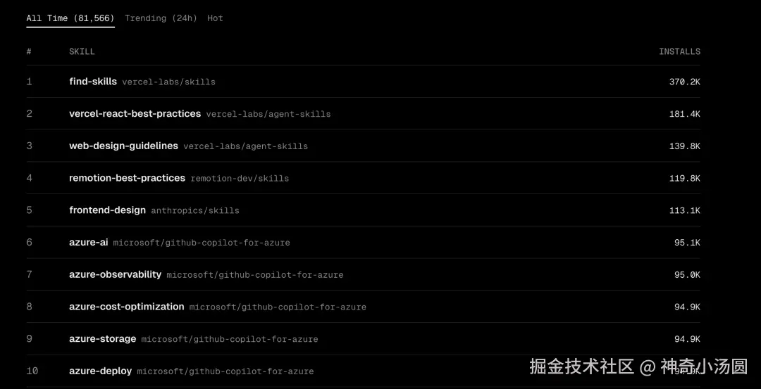不知道装什么好?直接看这个。skills.sh 会按 24 小时内的安装量排序,让你知道现在最火的是什么。
