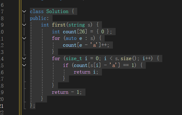 注:查找数组中唯一出现的字符,字符只有26个,直接定义一个数组来记录每个字母出现的次数。