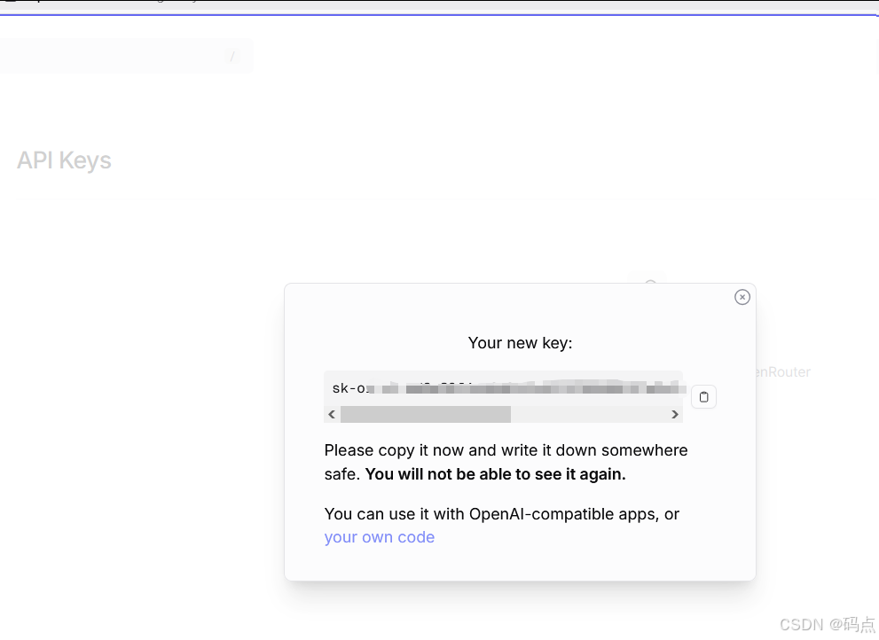 注册一个账号登录,然后就会提示你去创建 API KEY,直接去创建,,创建好之后是这样一个 sk- 开头的文本,自己保存一下。