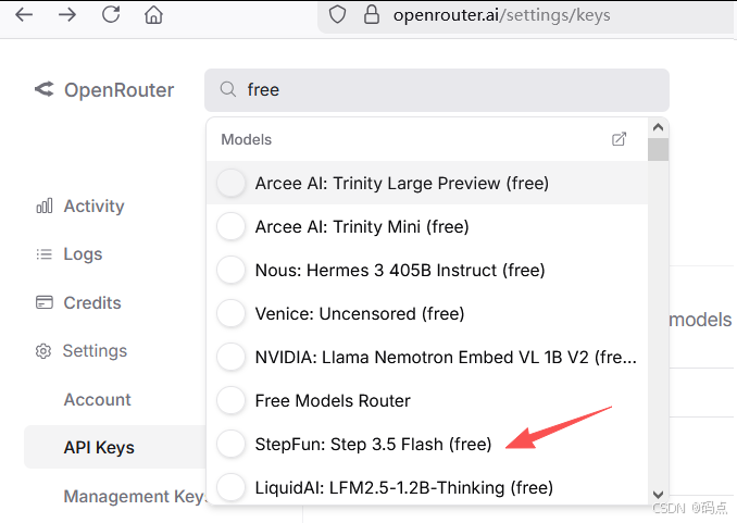 - 配置免费模型,在 OpenRouter 上搜索可用的免费模型,我选的是