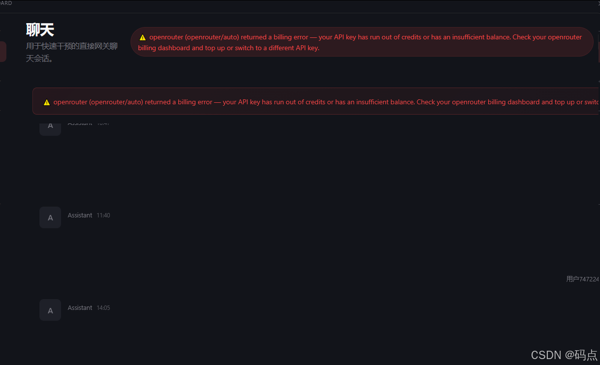 openrouter (openrouter/auto) returned a billing error --- your API key has run out of credits or has an insufficient balance. Check your openrouter billing dashboard and top up or switch to a different API key.