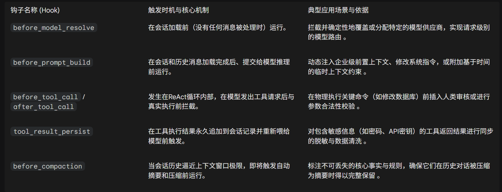 在将标准化的消息交付给大模型驱动的循环之前与之后,网关提供了一系列强大的拦截器钩子(Hooks)。这些钩子是传统软件工程在不可靠的大型语言模型外围建立防护栏的重要手段 。