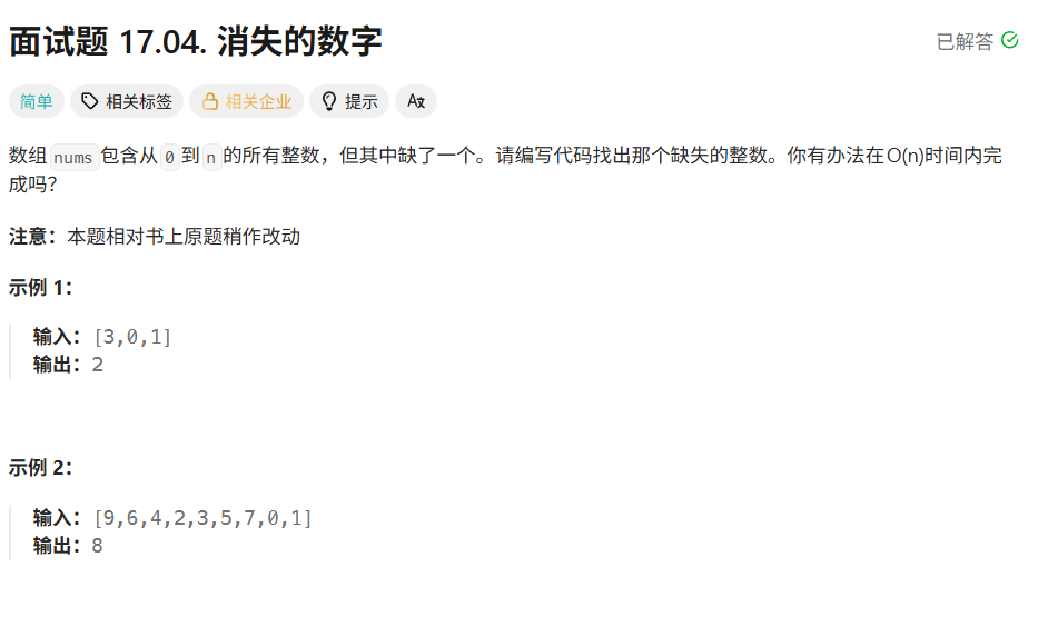 题目链接 :https://leetcode.cn/problems/missing-number-lcci/description/