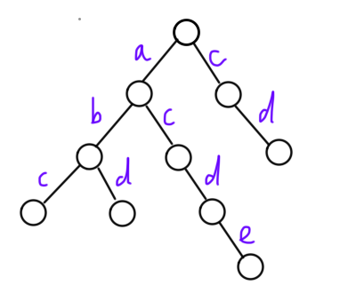 我们可以把字典树想象成一棵多叉树 ,每一条边代表一个字符 ,从根节点到某个节点的路径就代表了一个字符串 。通过字典树存储字符串可以节省存储字符串的空间。例如,要存储 "abc"、"abd"、"acde" 以及 "cd" 时,构建的字典树如下:
