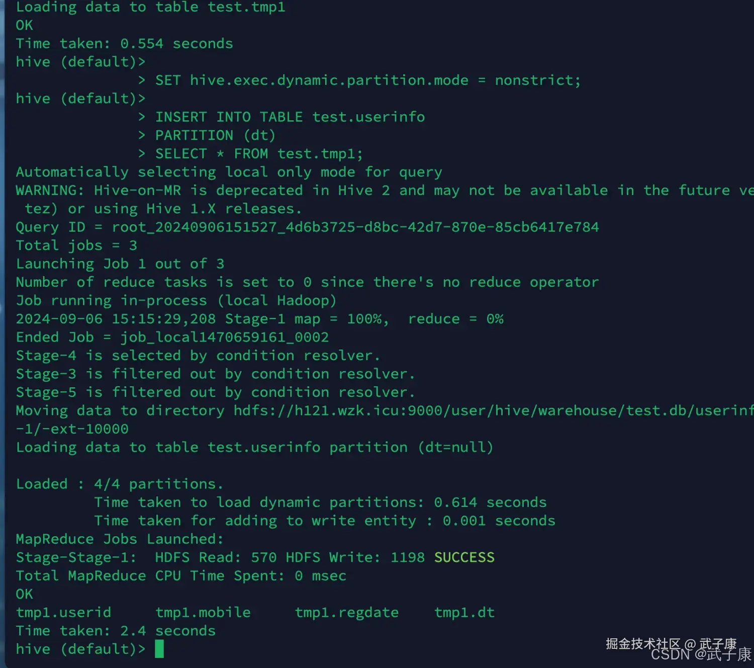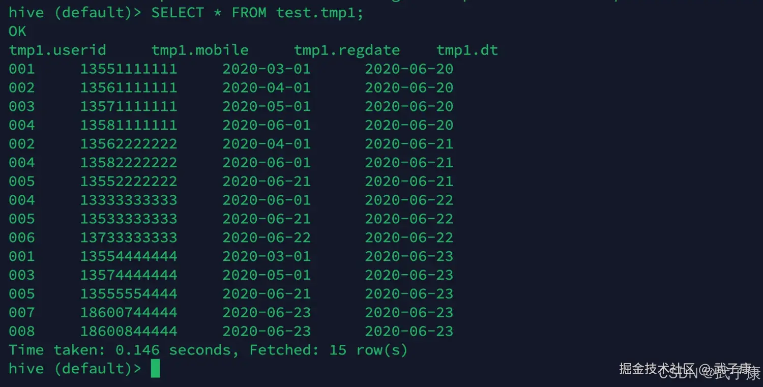 | LOAD DATA 后字段错位或分隔失败 | 中间表默认 SerDe 与源文件分隔符不一致 | SELECT * FROM test.tmp1 检查导入结果明确建 tmp1 的字段与分隔符,避免依赖 CTAS 后再改 SerDe |