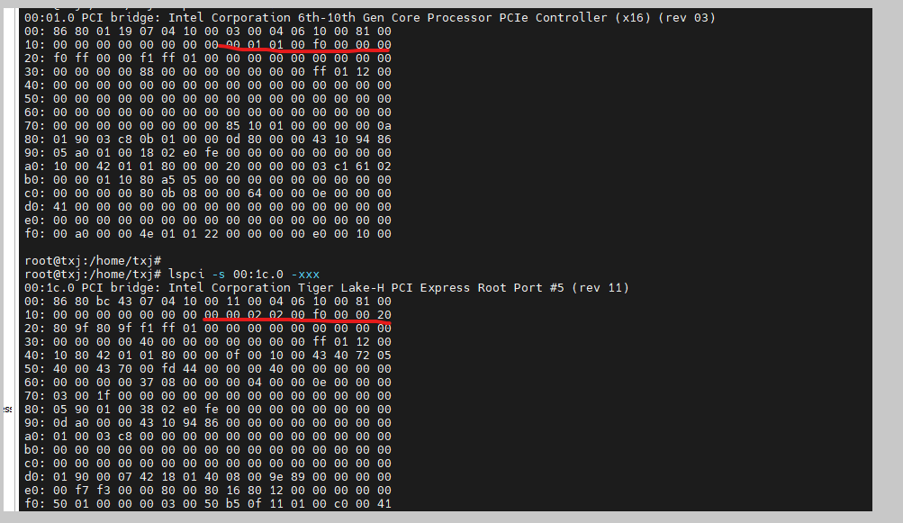 其中,00:01.0和00:1c.0是pcie 桥(可以根据0x0E的bit0确定是一个type1设备)