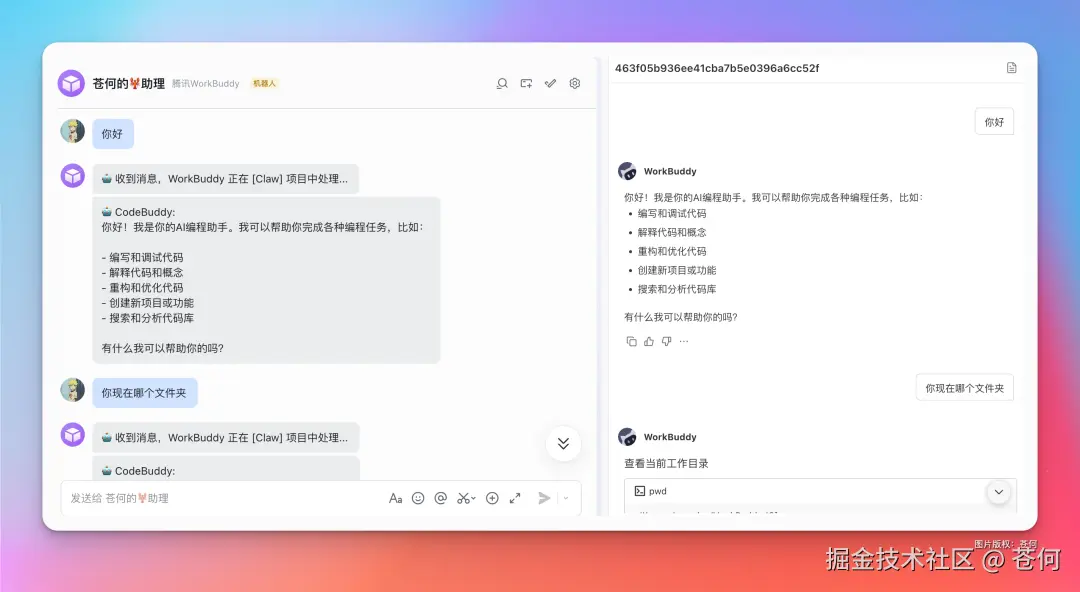 在飞书中开始对话,就可以看到能操控 WorkBuddy 了,而且默认的 claw 文件夹就是用户的 /WorkBuddy/Claw 文件夹。