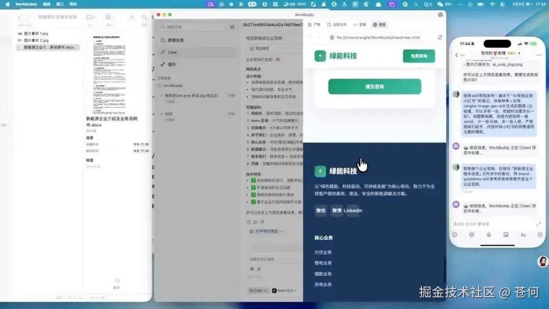 在手机飞书指挥着 WorkBuddy Claw 帮我开发企业官网,所有的素材来源是在我的电脑文件夹中,包括图片和企业官网素材。