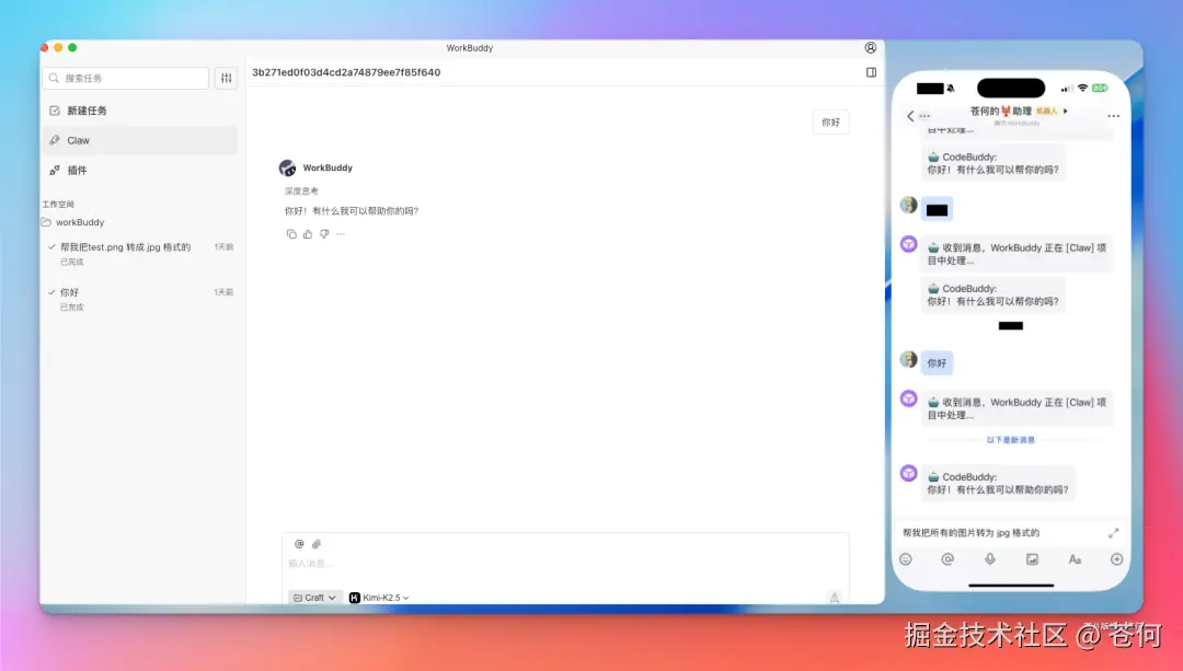 不过不同的是,WorkBuddy Claw 可以通过企业微信、飞书、钉钉、QQ等日常 IM 工具中,通过手机直接指挥 WorkBuddy 干活。