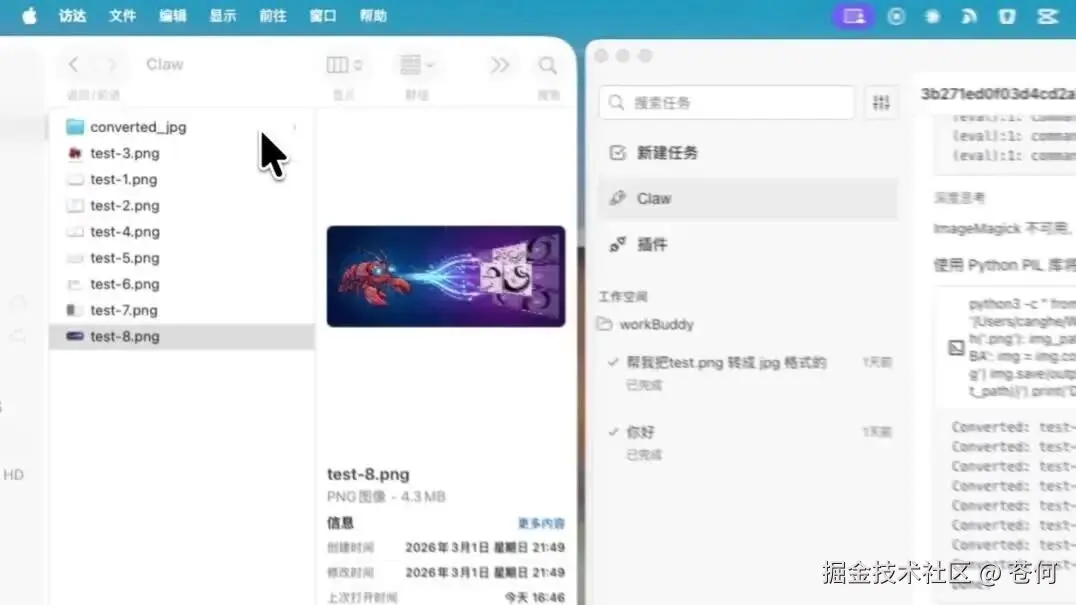 比如,我在手机飞书上,让 WorkBuddy 帮我把所有 png 格式的图片转为 jpg: