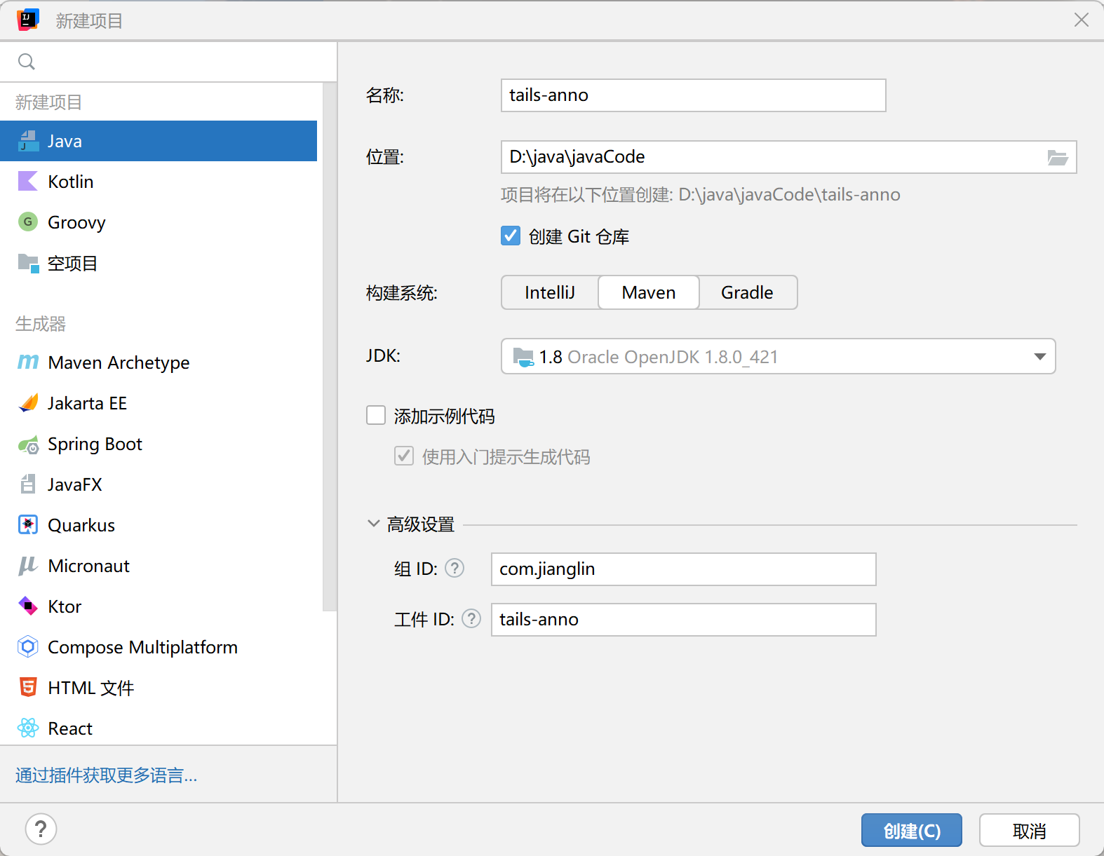 创建项目时,选择maven即可,之后可导入所需要的依赖。