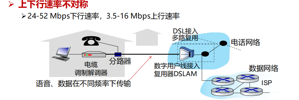 DSL (数字用户线) :利用现有电话线,通过不同频率同时传输语音和数据,带宽非对称(下行 > 上行)。