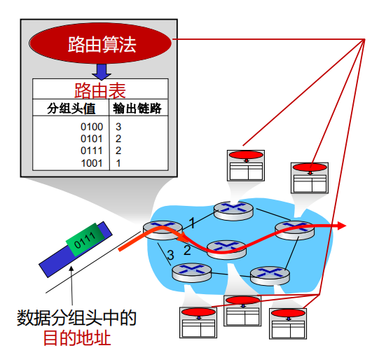 - 路由:全局操作,通过路由算法确定分组从源到目的地的路径(生成路由表)。