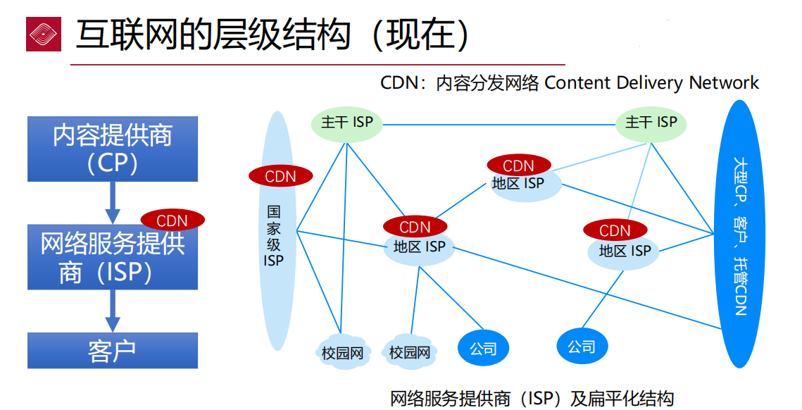 - ISP (网络服务提供商) :互联网由ISP(如中国电信、中国联通、AT&T等)构成的多层结构。