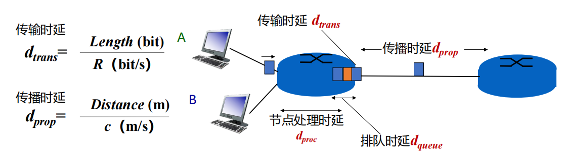 处理时延 (dprocd_{proc}dproc):主机或路由器在收到分组时,为处理分组(如分析首部、提取数据等)所花费的时间。