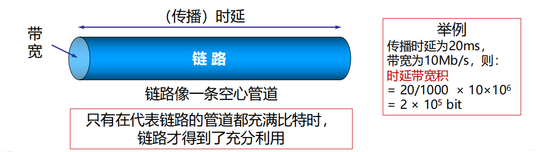 - 传播时延×带宽\text{传播时延} \times \text{带宽}传播时延×带宽,代表链路中容纳比特的能力,即按比特计数的链路长度。