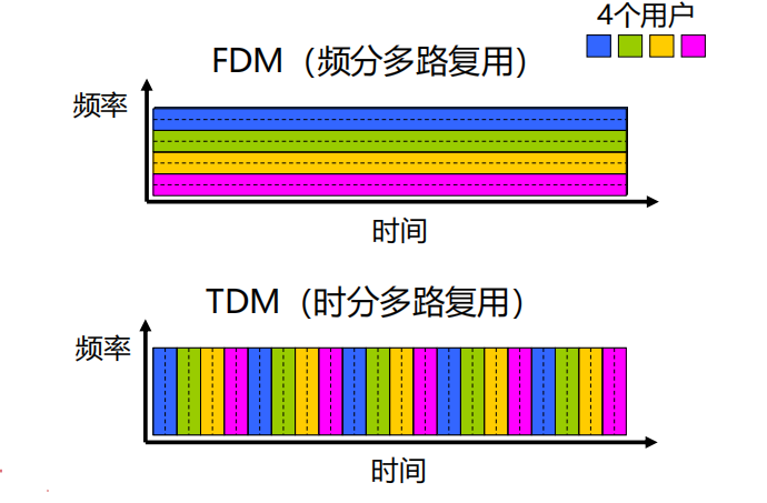 频分复用 :将链路的总带宽(频率范围)划分为多个不同的频段,每个连接分配一个特定的频段,所有用户在同一时间 占用不同频率。