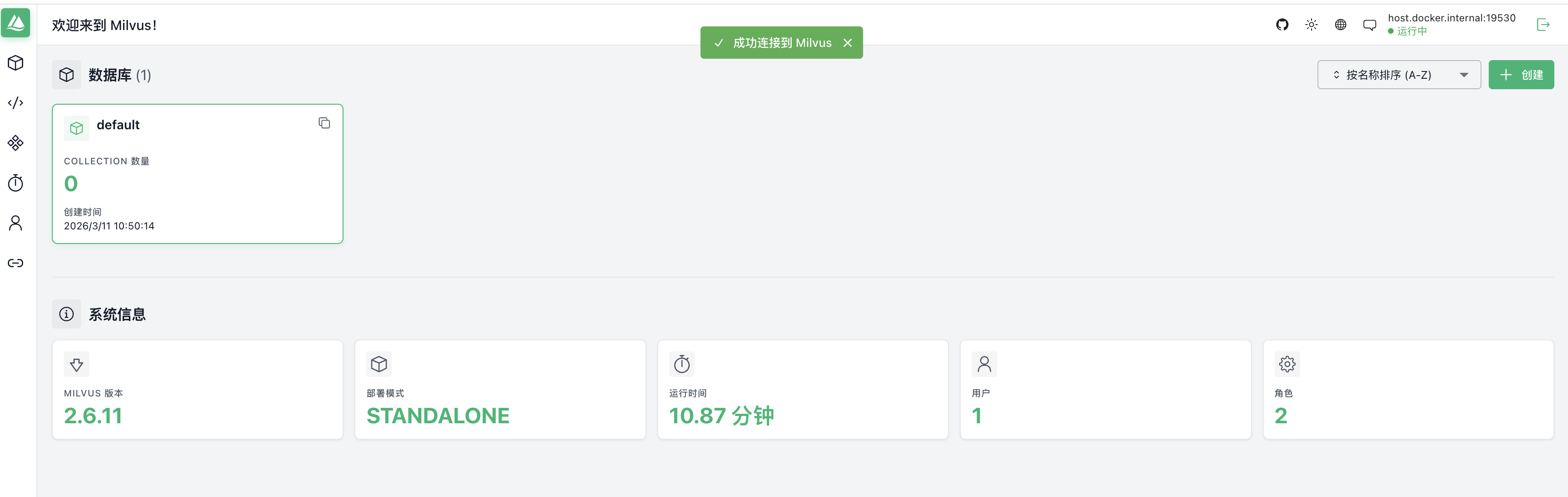 在连接地址处输入host.docker.internal:19530即可登陆。