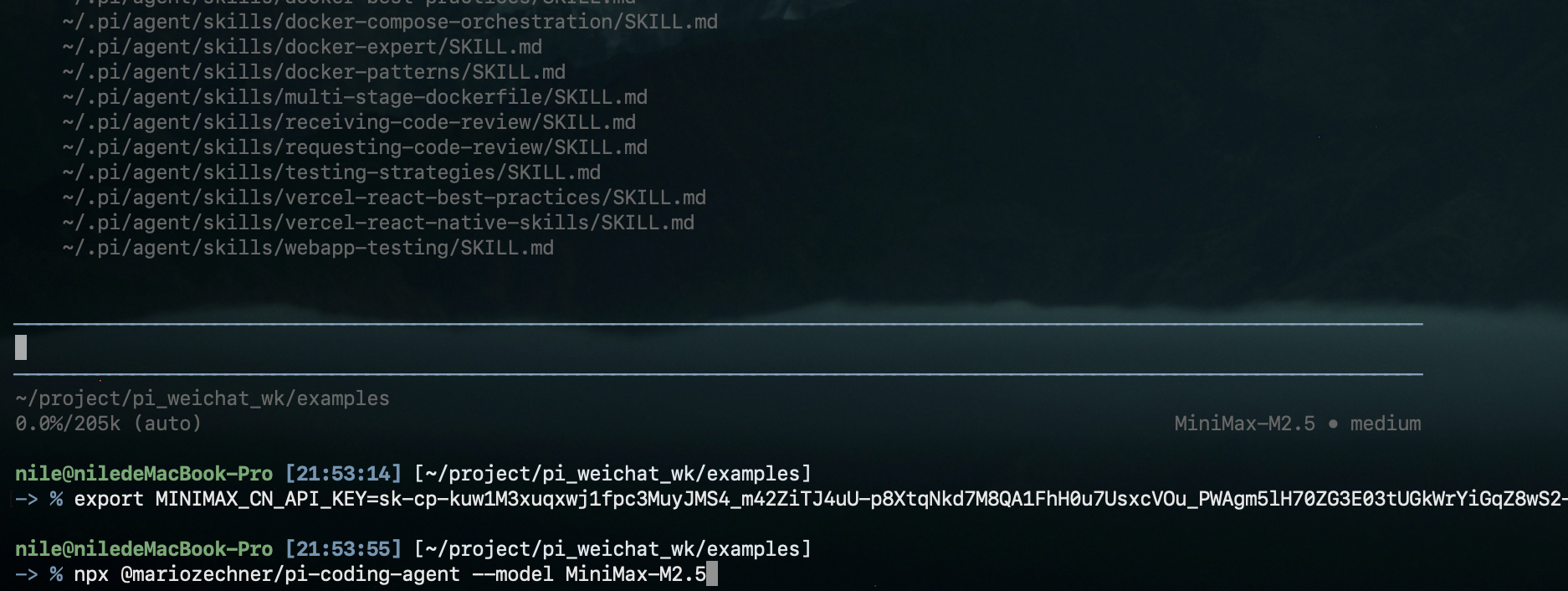 npx @mariozechner/pi-coding-agent --model MiniMax-M2.5