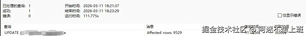 SELECT CONCAT('批次:', batch_num, '| 累计:', total_updated, '| 剩余:', (SELECT COUNT(*) FROM tmp_update_ids)) AS progress;