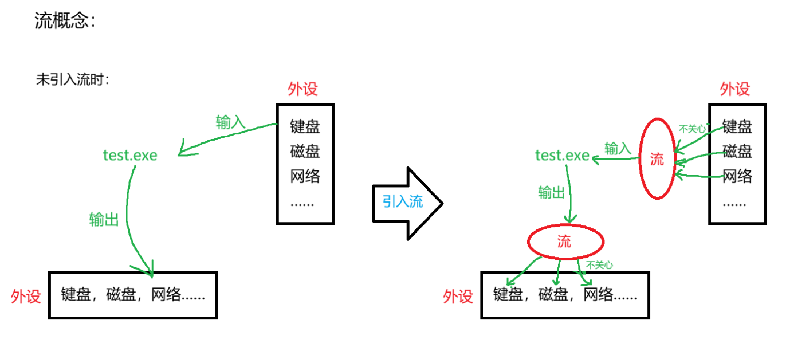 引入流之后我们只关心如何对流进行操作,不用关心流对每一个外设的操作是如何的。