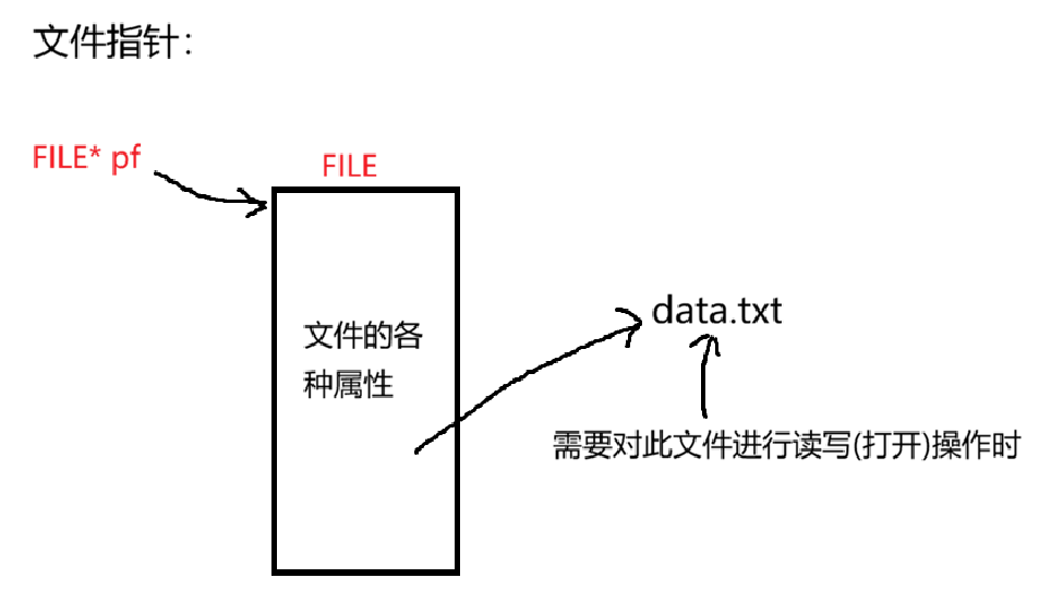 每当一个文件被打开时,会在内存中创建一个叫文件信息区(当中存放文件的名字,文件的大小等的属性)的一个结构体变量,与其对应文件相关联,并将次结构体变量typedef重命名为FILE*类型。如下图所示: