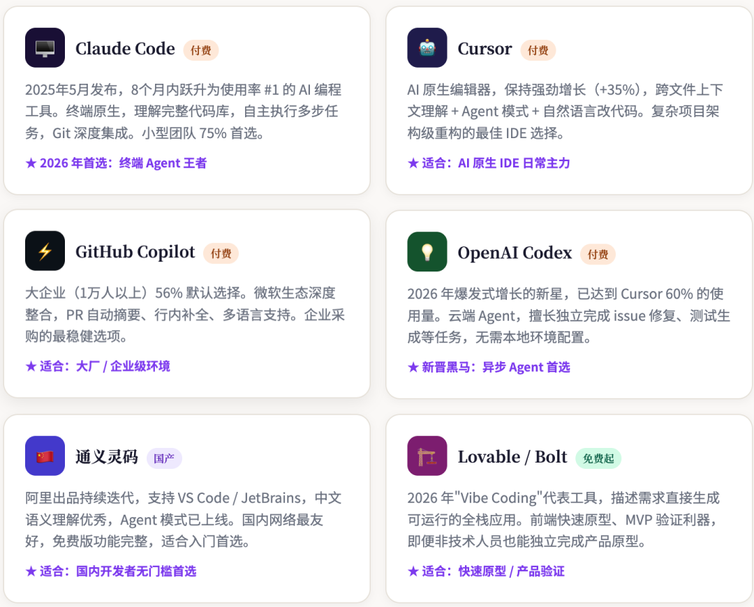 工具格局在 2026 年发生了根本变化:终端 Agent 成为新主流,IDE 插件变成标配底线。204 种工具被追踪,但真正值得花时间的不超过 6 个。以下按分层配置推荐: