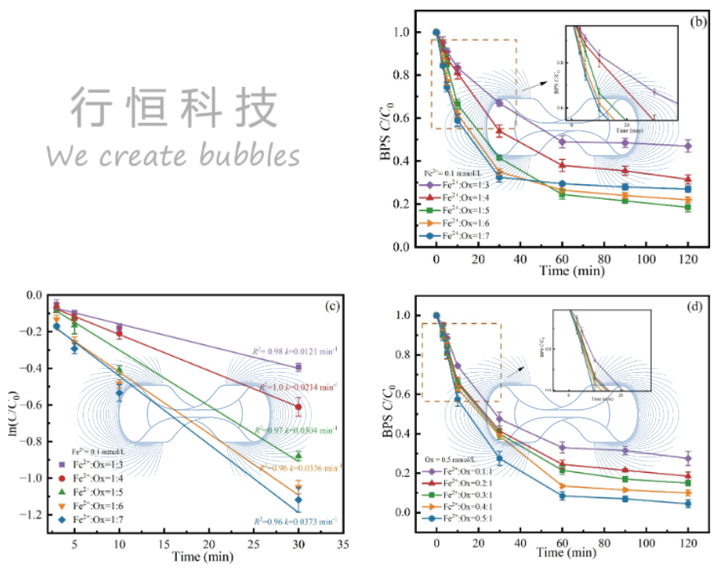 本研究旨在克服传统亚铁活化分子氧(Fe2+/O2)体系因氧利用率低而受限的难题。研究创新性地将具有卓越增氧能力的微纳米气泡技术与具有更强O2活化能力的Fe2+-草酸盐络合物相结合 ,构建了MNBs/Fe2+/Ox协同系统。系统中,MNBs采用行恒科技的LF-1500微纳米气泡发生器产生,工作压力保持为0.4 MPa。