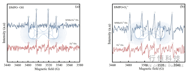 电子顺磁共振(EPR)和探针实验表明,该体系产生的主要活性氧物种为**羟基自由基(·OH)和超氧自由基(O2·-)** ,未检测到单线态氧(1O2)和铁(IV)。MNBs的参与显著增强了体系中ROS的信号强度。