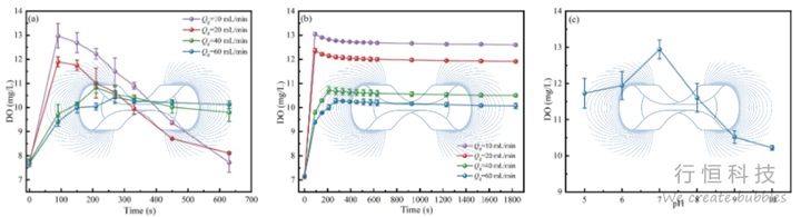 通过优化微纳米气泡发生器的进气流量(Qg)、曝气时间和pH,确定了最佳增氧条件为:Qg = 10 mL/min,曝气时间 = 90秒,pH = 7。在此条件下,溶解氧(DO)浓度峰值最高,且后续维持稳定。