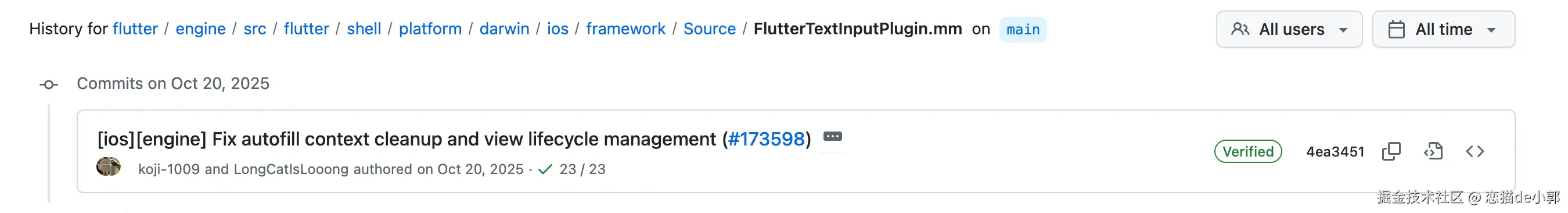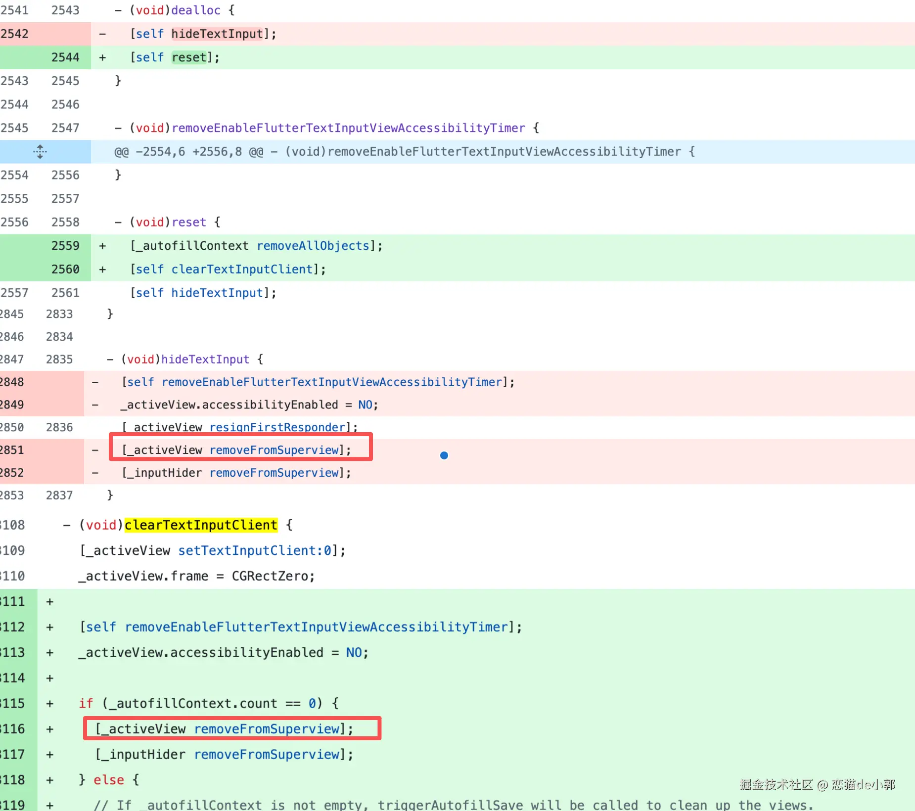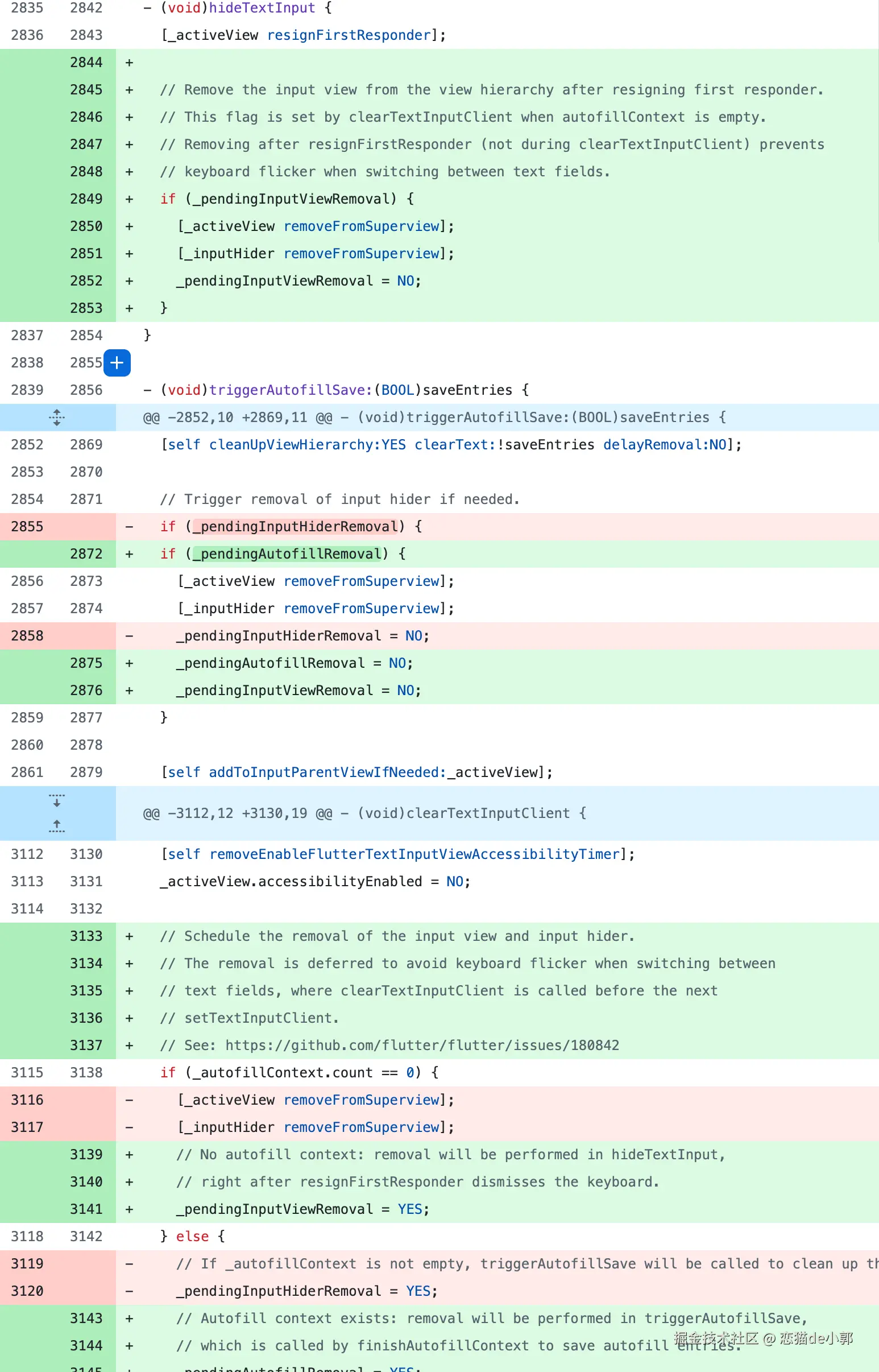而从目前的情况来看,问题的来源是以下这个 PR ,它是一个用来修复 autofill 上下文清理的提交,在这个 commit 里,他对 FlutterTextInputPlugin.mm 进行重构,主要是简化输入视图的生命周期管理: