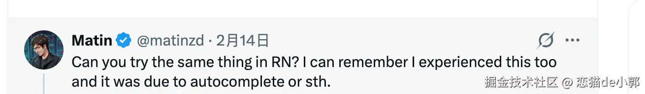 因为无论是 Flutter 还是 RN,它们都不是"原生实时渲染",而是通过一个中间层与 iOS 通讯,所以 RN 也有过类似键盘高度计算等问题, 不过 RN 上主要是 AutoFill UI + layout 竞态导致的问题。